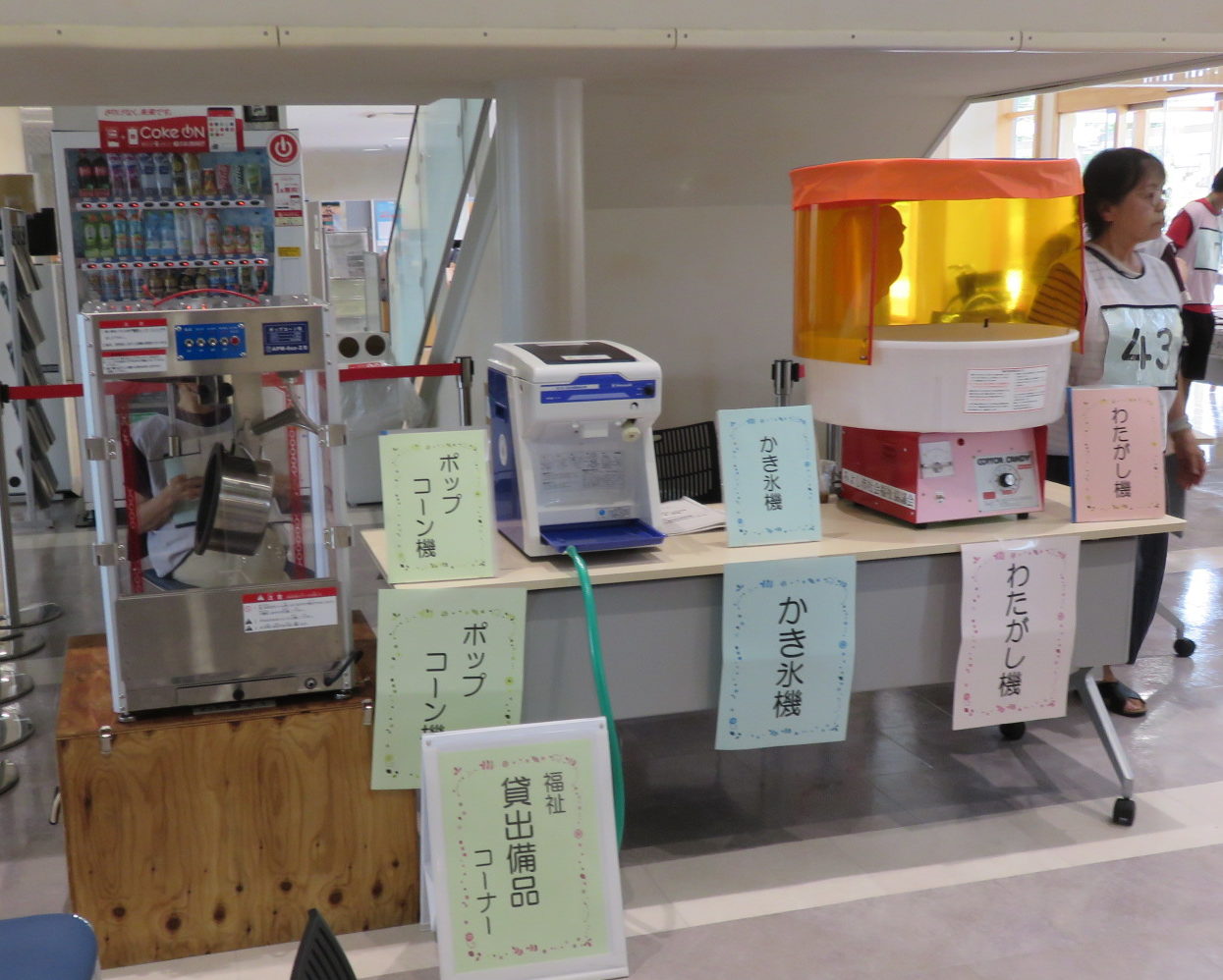 紹介コーナーでは、皆さんの活動に活かしていただきたいと、誰でも気軽にできる「モルック紹介コーナー」、社会福祉協議会で無償で貸し出しを行っている「福祉貸出備品紹介コーナー」を設けました。🍧