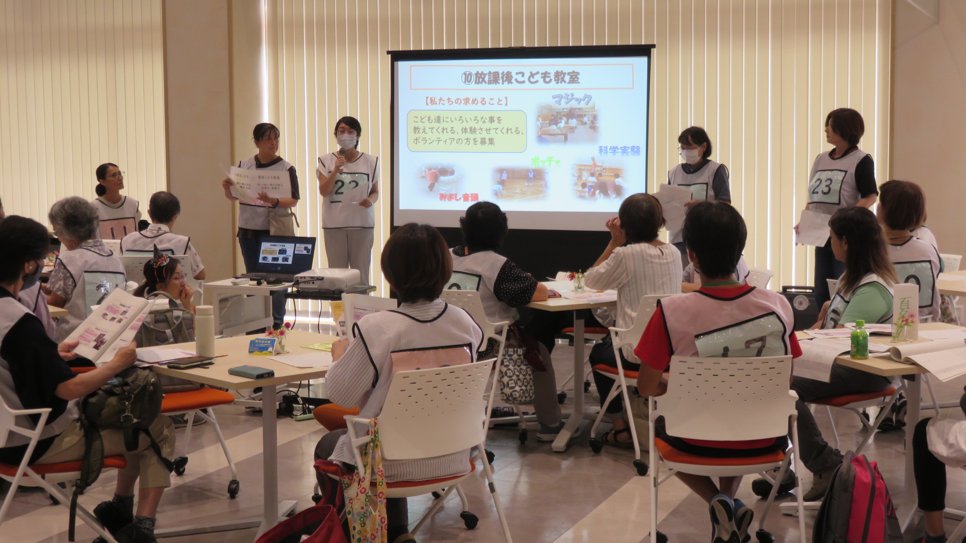 はじめに、みよし市役所長寿介護課と保険健康課の保健師2名を講師としてお招きし、「楽しもう大人の今日用(教養?)」と題して、ボランティア活動を行うことにより、「脳の活性化、ヤル気・精神安定・愛情などのホルモンの分泌を促進し、フレイル予防につながる」ことや、地域活動の展開における出会いや学びが、自分自身の生きがい・やりがいを見つけるきっかけになると、ユーモアを交えお話しいただき、参加者は前のめりになり話に聞き入っていました。